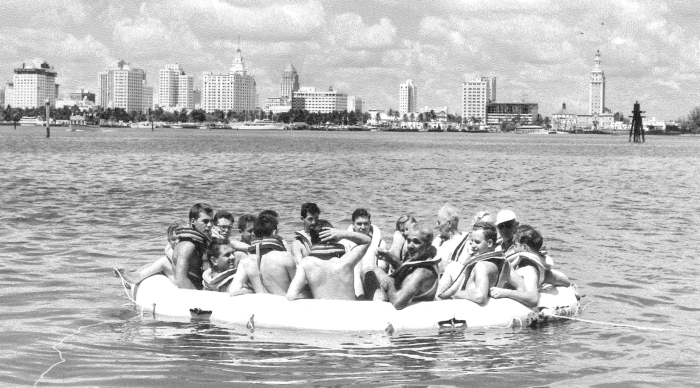 Continuing a line of inquiry and exchange begun a year ago, we’ve invited Nathaniel Sandler to create a second new piece of fiction inspired by an archival photograph. In this instance the photograph, taken in 1955, stood out when looking through Sandler’s personal archives as the circular raft at the center of the image reminded us of the shape of our current Main Office building. It confronts us with a perplexing mix of a familiar set of ingredients, including 18 (white) men inside of the inflatable, all with Miami’s classic 50’s skyline in the background.