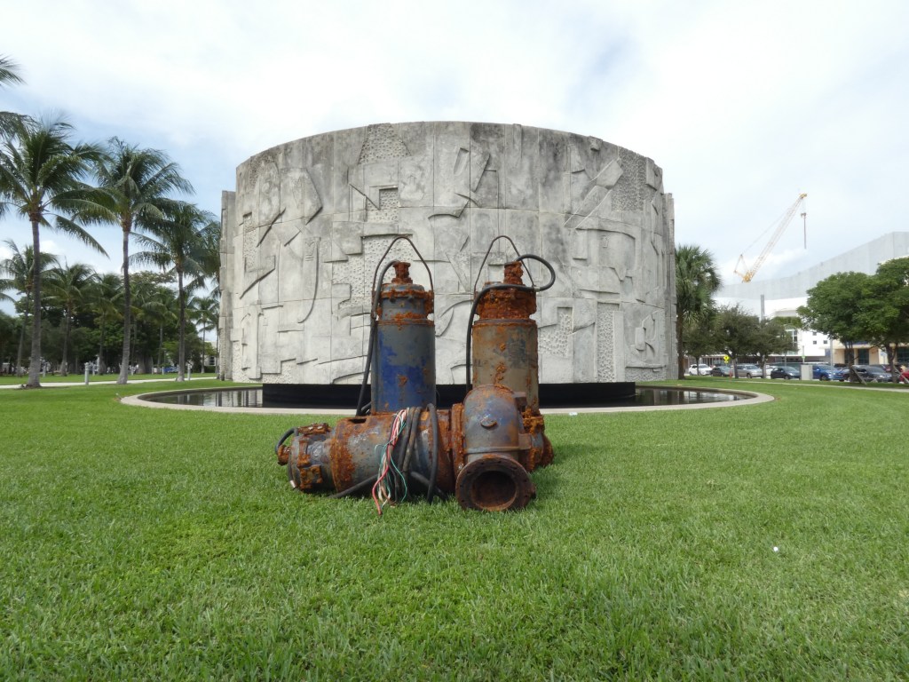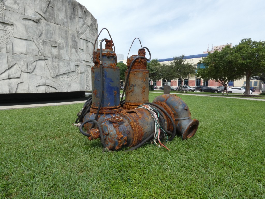 A group of recently decommissioned City of Miami Beach submersible saltwater pumps are presented as an imposing ready-made public sculpture. Part abstract infrastructure, part documentary object/s, the formerly invisible and heavily corroded submersibles physically make real, and very much present, the immediate material and infrastructural effects of sea level rise upon the given Miami Beach environment.