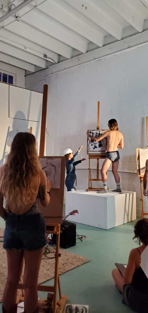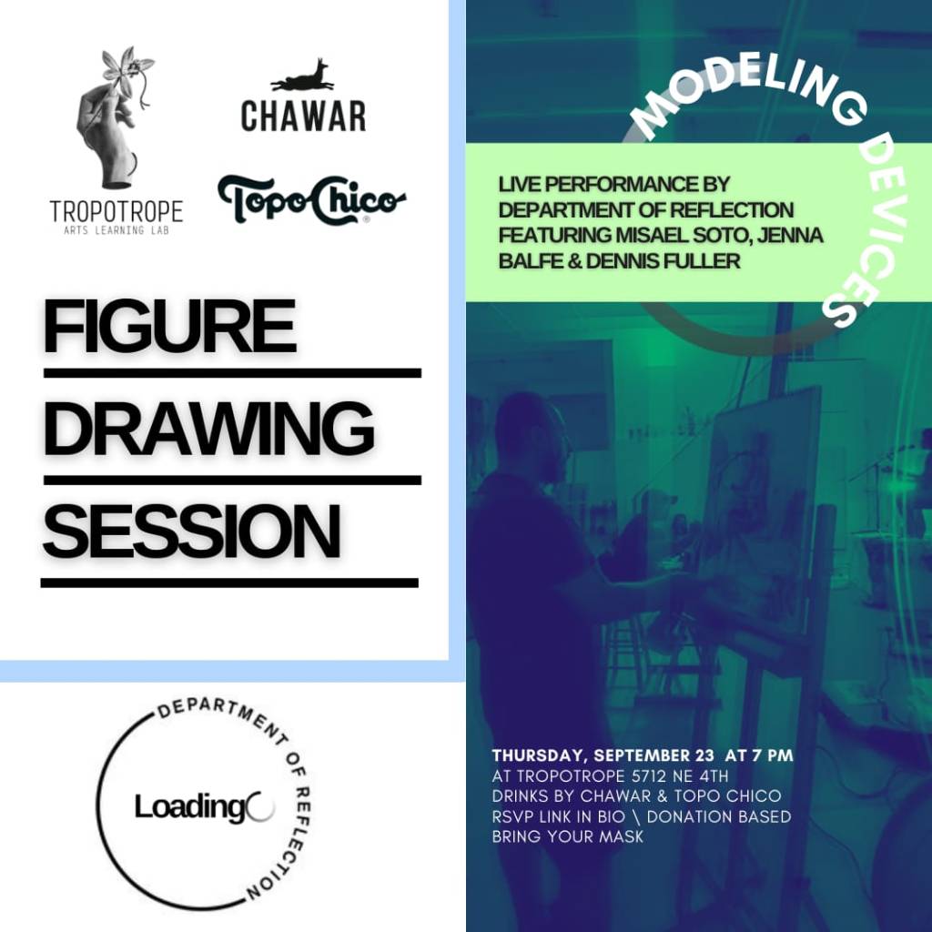 The Department of Reflection presents a figure drawing class about figure drawing, with three models who begin the class drawing their audience while the audience draws them. The reflective and self-reflexive performative gesture then folds in on itself with each following timed drawing session, deconstructing and layering internal rules of engagement that eventually crash into a sound performance by Donzii.