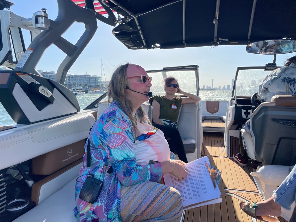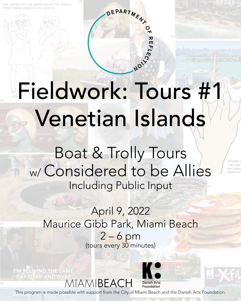 For the Department of Reflection’s first Fieldwork: Tour we’ve invited expert outsiders Considered to be Allies to Miami, specifically Miami Beach’s Venetian Islands, and asked them to help us investigate the famed millionaire mounds and surrounding waters, including Isola di Lolando, the Venetian Island that never was. Via mirrored tours happening simultaneously, one on a trolley bus and another on a small boat, the woman and her colleague will guide participating residents in a hands-on presentation of their findings, including public input collected by DoR.