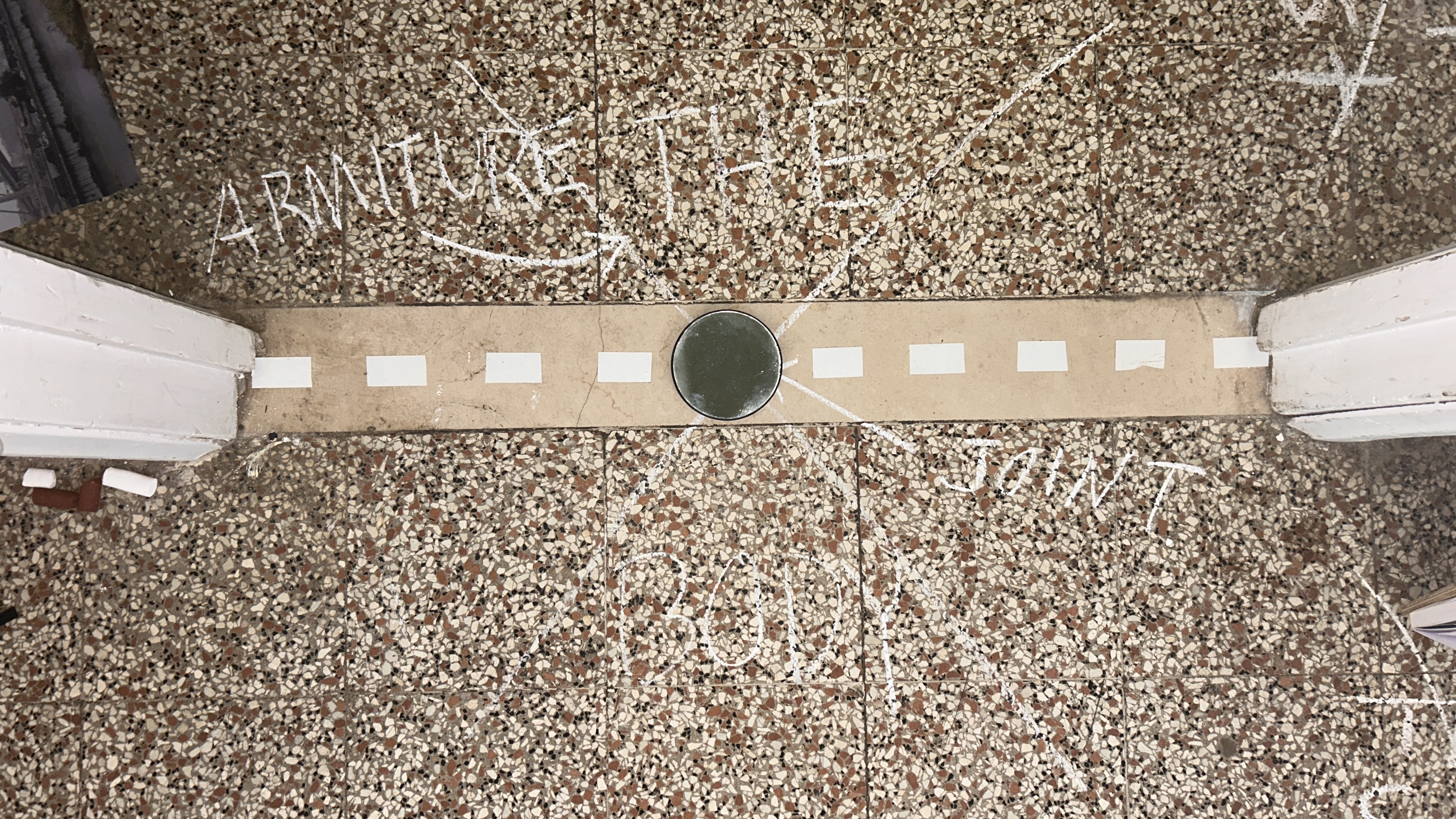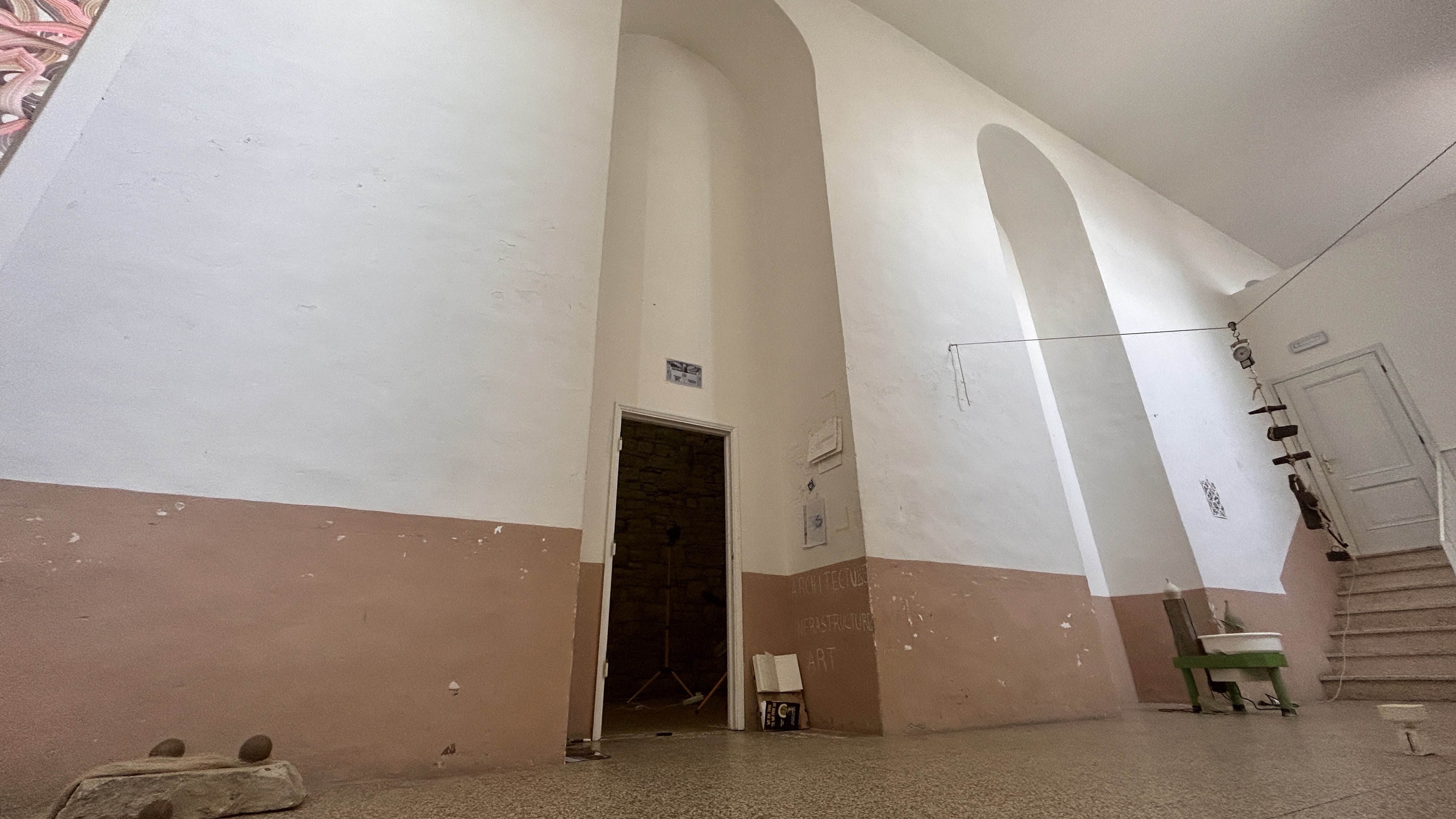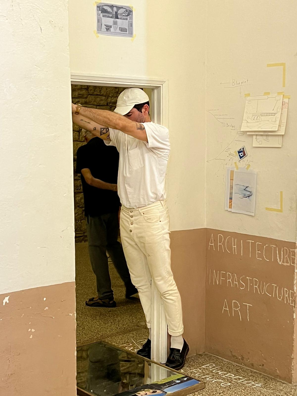 De-Code Compliance (for Monte Castello di Vibio) continued research and development begun at the start of the year in conjunction with Bridge Deconstruction in Miami. Conducted in and around the small medieval walled village in central Umbria, Italy, particular attention was given to a nearby bridge spanning the legendary Tiber River below and the bridge’s multigenerational hybrid construction. Our research culminated with a performative investigation in situ under an architectural arch feature and threshold within the town’s gallery space and the context of Poor Farm‘s “Living in the Play: Nido II” residency exhibition featuring 17 artists. Over the course of a day, DoR director misael soto used various tools, writing, and found and taken images in order to visually and conceptually layer geographies, bridges, architectural and infrastructural elements, histories, and recent thoughts and theories. misael engaged with visitors to bring in further layers and recordings of their findings were made on the walls and floor as the process unfolded.