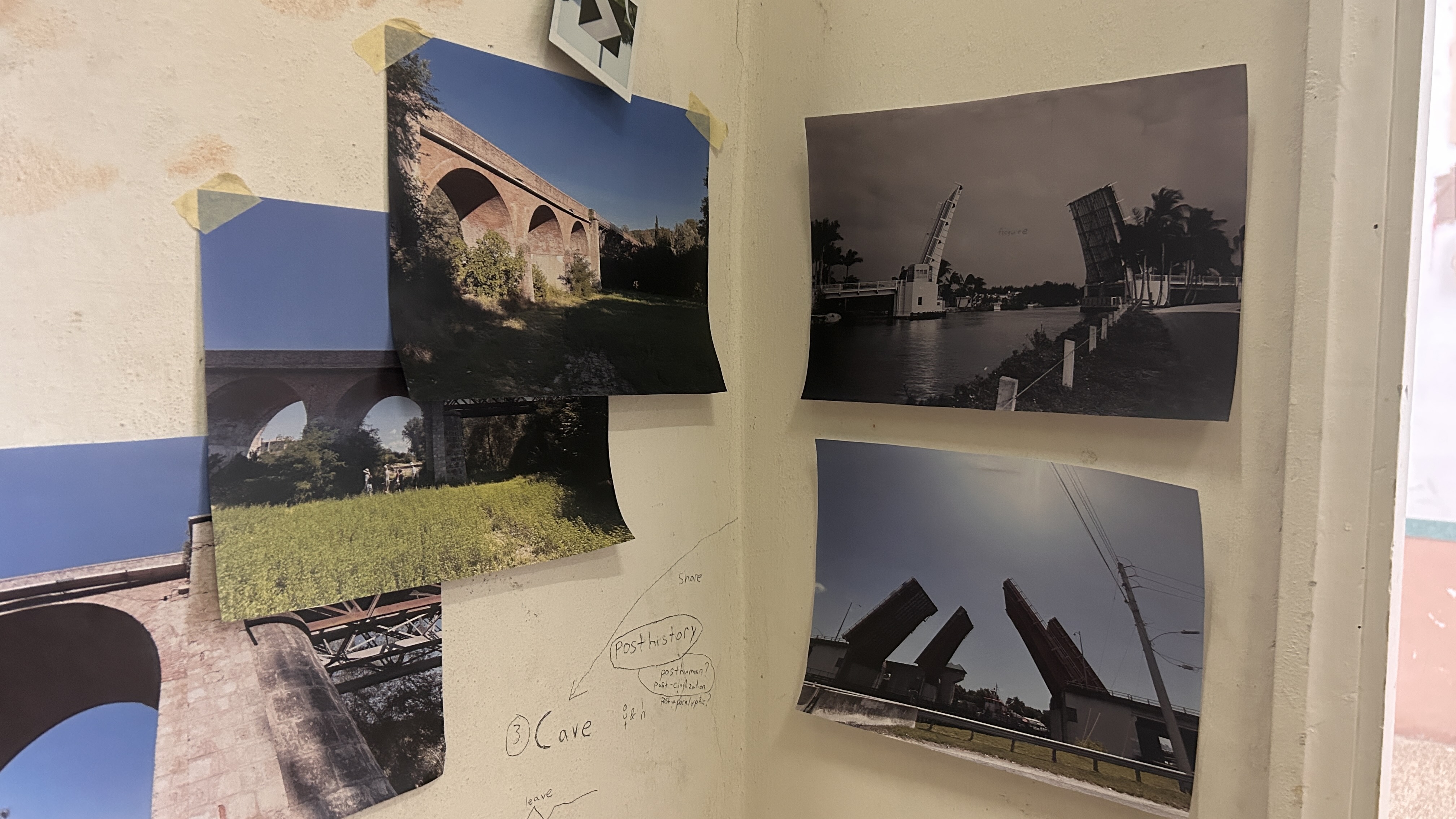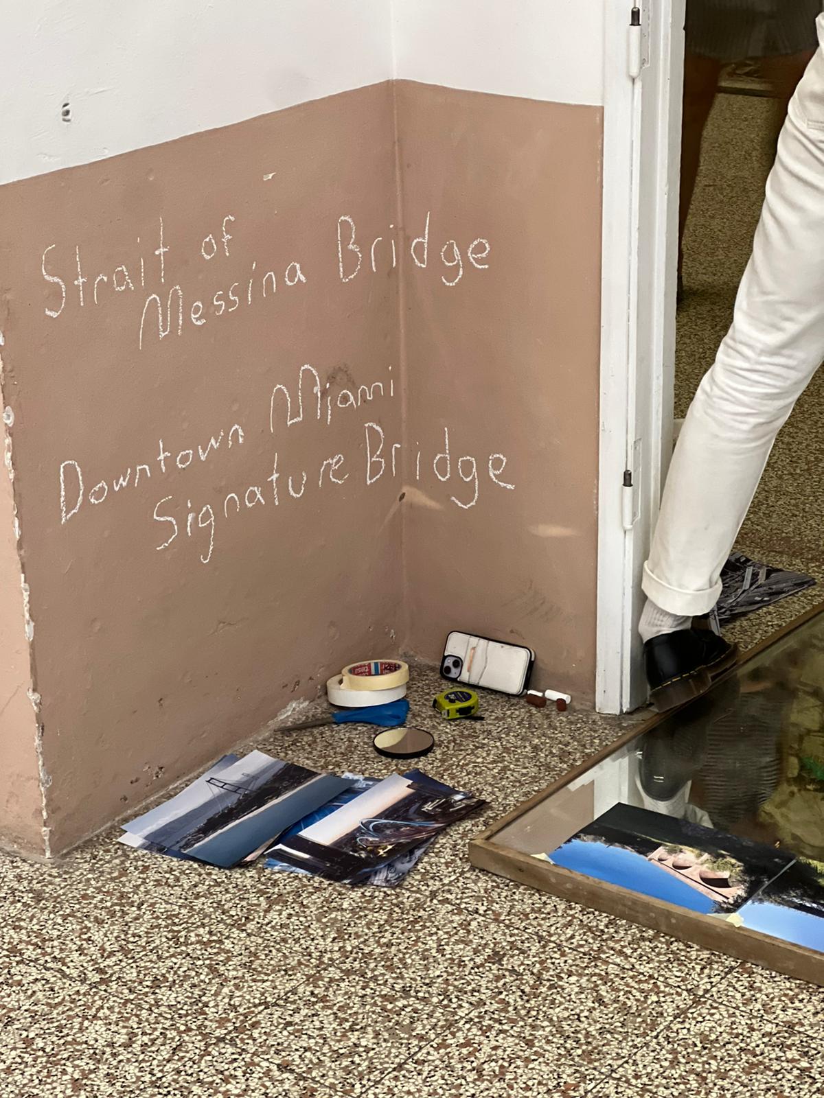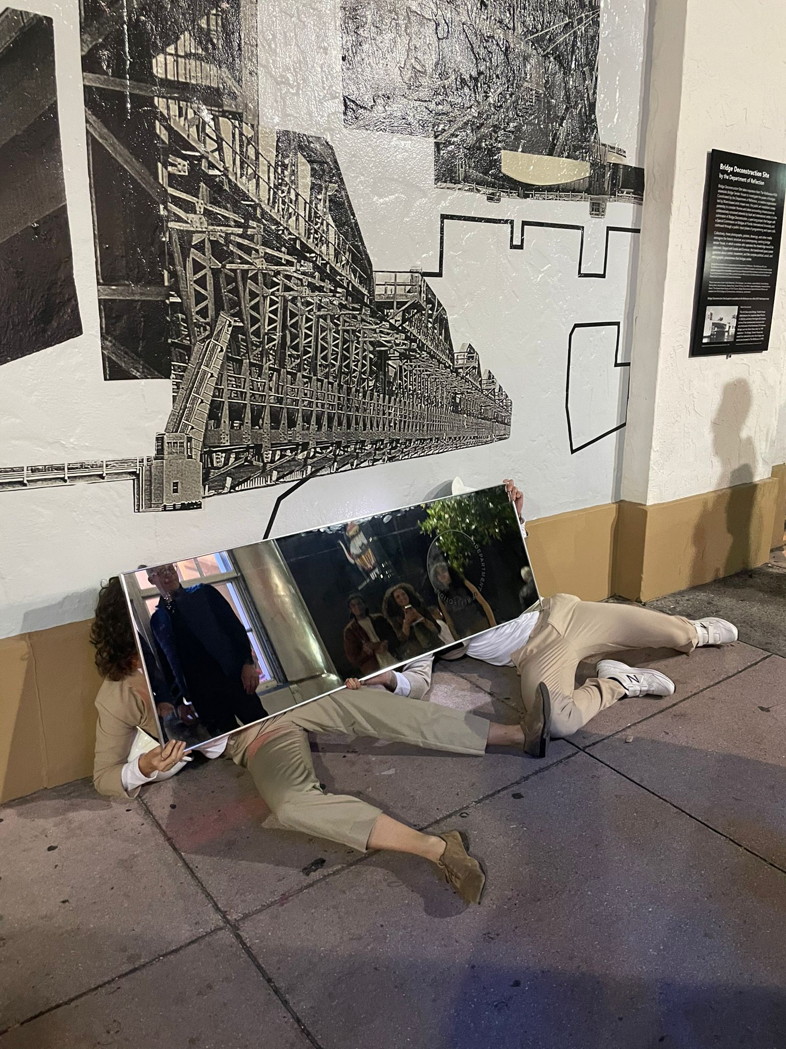 The Department of Reflection’s De-Code Compliance Team (Jenna Balfe and misael soto) conducted work in and around The Wolfsonian-FIU’s Bridge Tender House as part of our Bridge Deconstruction. Over the course of an evening, the team used various tools, writing, found and taken images, and bodily investigative techniques in order to visually and conceptually layer geographies, bridges, architectural and infrastructural elements, histories, and thoughts and theories related to Bridge Deconstruction. Visitors were engaged to bring in further layers and recordings of our findings were made as the process unfolded, leading to new communal knowledge.