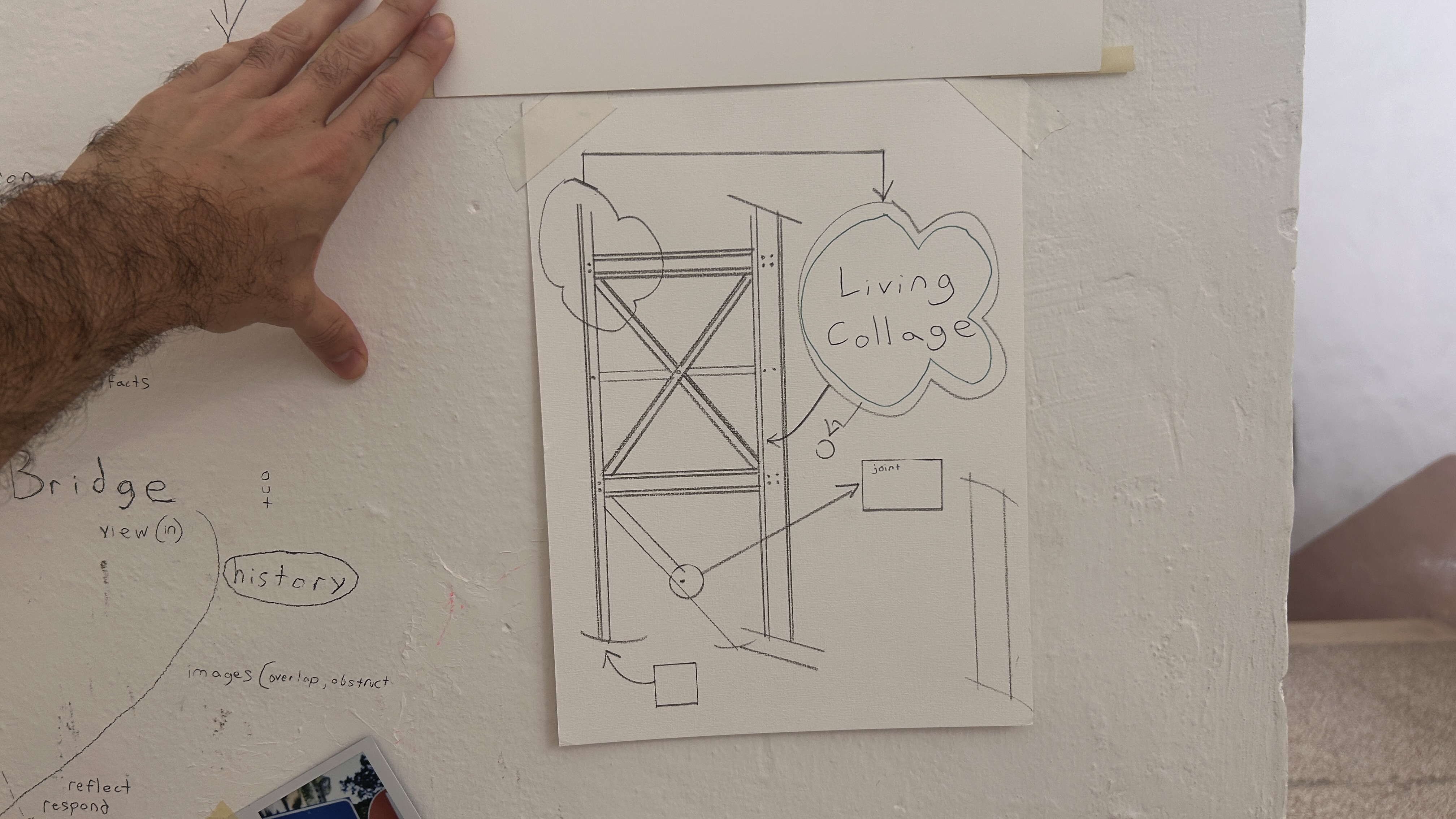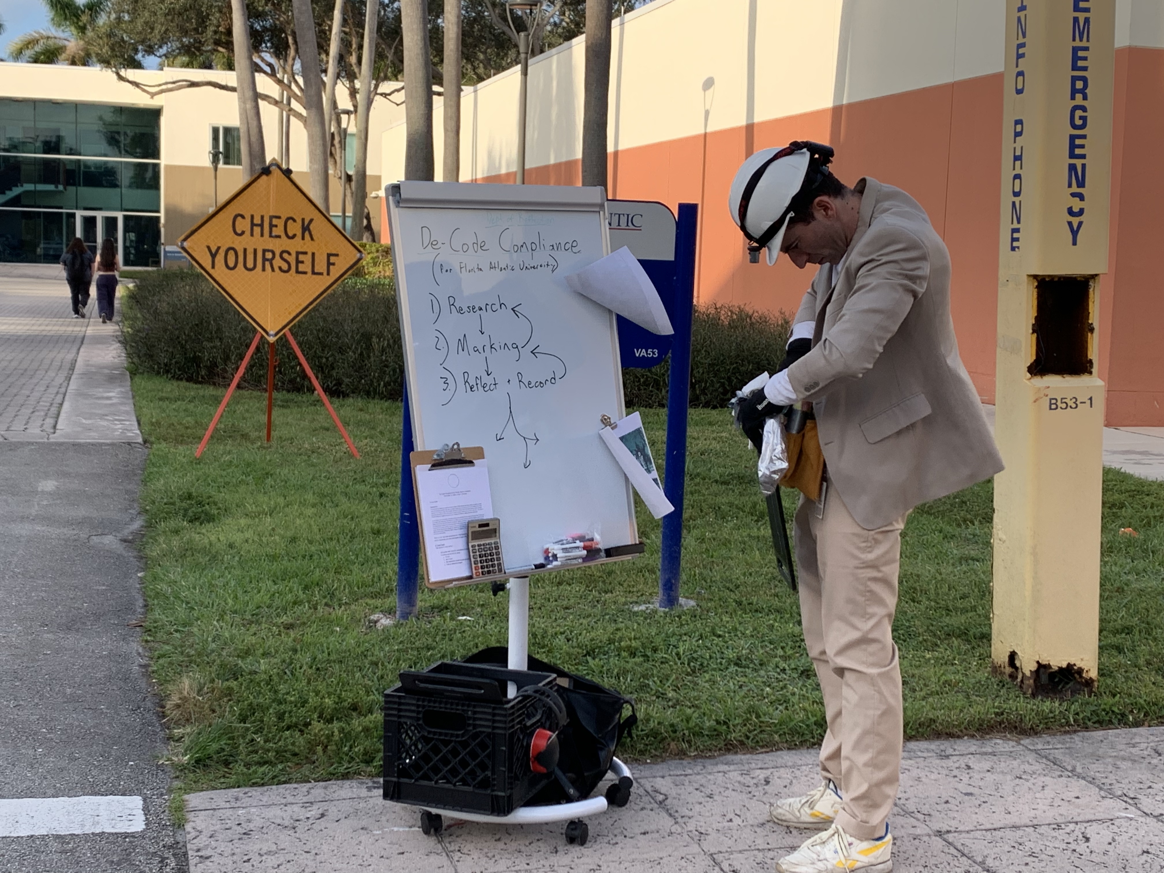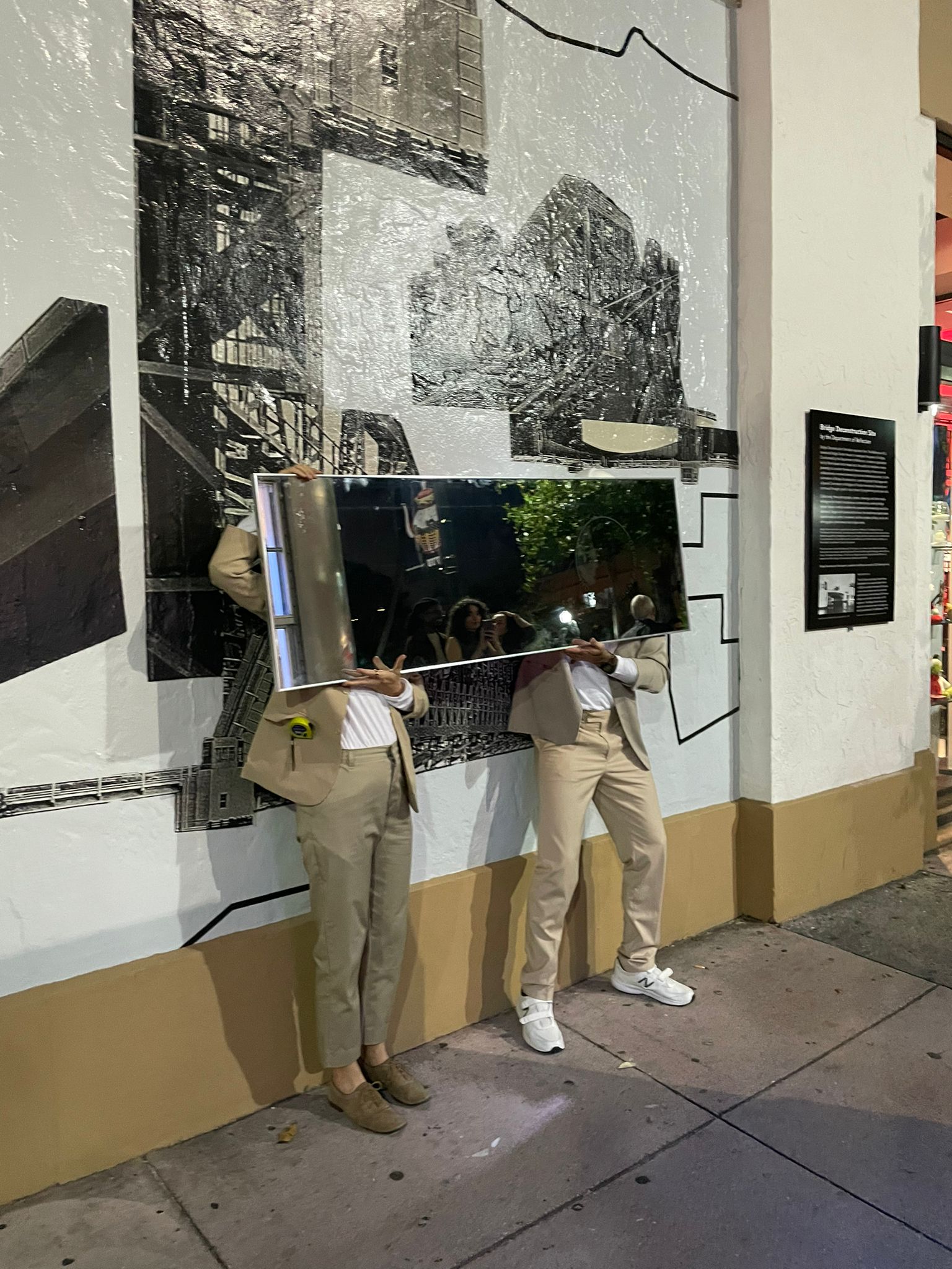 The Department of Reflection’s De-Code Compliance Team (Jenna Balfe and misael soto) conducted work in and around The Wolfsonian-FIU’s Bridge Tender House as part of our Bridge Deconstruction. Over the course of an evening, the team used various tools, writing, found and taken images, and bodily investigative techniques in order to visually and conceptually layer geographies, bridges, architectural and infrastructural elements, histories, and thoughts and theories related to Bridge Deconstruction. Visitors were engaged to bring in further layers and recordings of our findings were made as the process unfolded, leading to new communal knowledge.